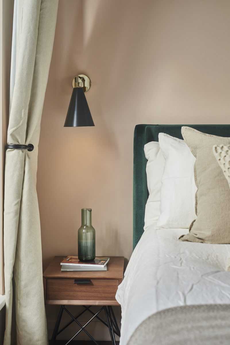 Стену у изголовья кровати можно оклеить обоями другого цвета или фактуры