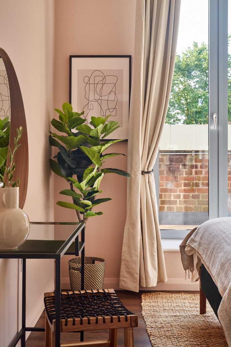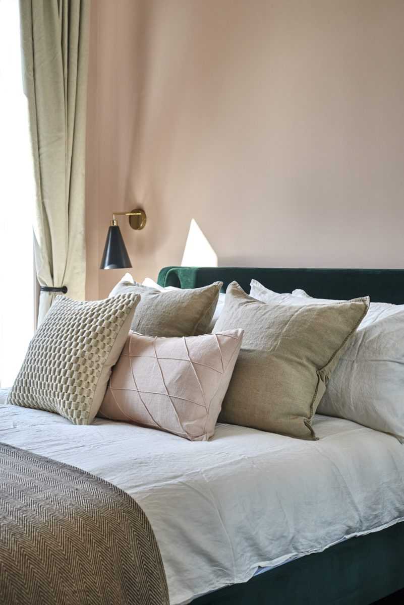 - При использовании краски значительно проще выполнить финишное покрытие при наличии в спальне каких-либо архитектурных форм и замысловатых элементов декора.