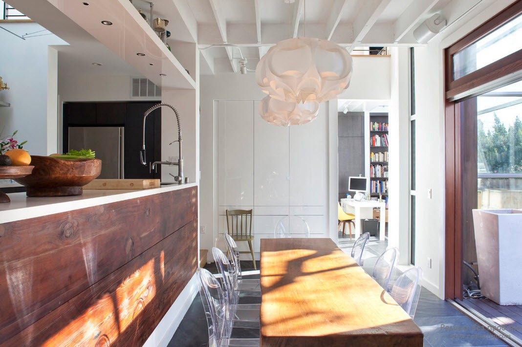 Сочетание с разными материалами в интерьере: стекло, камень, пластик, дает разный конечный результат, но неизменно то, что дерево является универсальной и популярной отделкой.