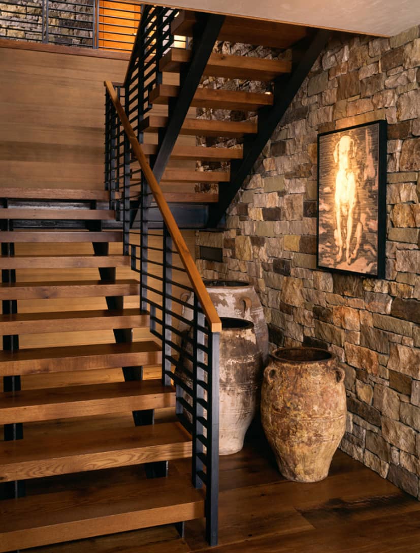 Особенный акцент в интерьер внесут безупречно отполированные поверхности ступеней и других элементов лестницы. Оптимальным решением для оформления перил, до сих пор остаются резные и кованные детали. На стенах уместно развесить картины в больших рамах с текстурой древесины.