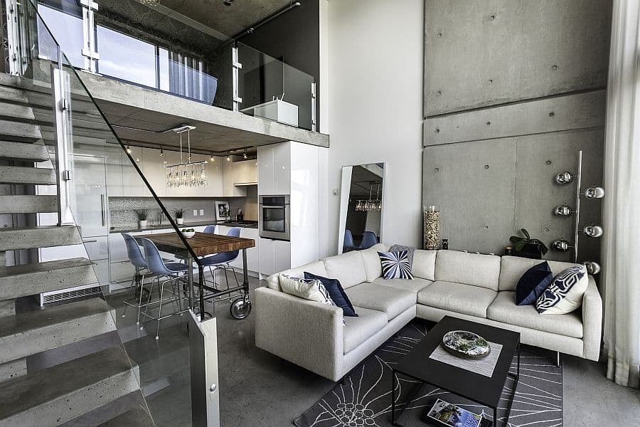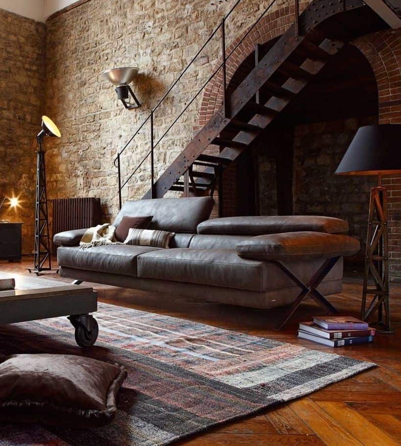 Бетонная или металическая лестница безупречно впишется в стиль лофт. Такие конструкции не требуют дополнительного декорирования, для них хорошим соседством станет кирпичная кладка на стене.