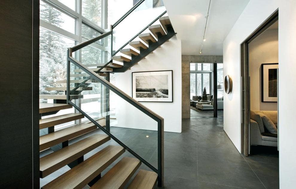 Лестницы в частном доме на второй этаж, решенные в стиле минимализм, полностью сливаются с общим пространством, не привлекая к себе внимания. Достигается это при помощи подбора фактуры и цвета. Удачнее всего сюда вписываются ступени, которые фиксируются на больцах.