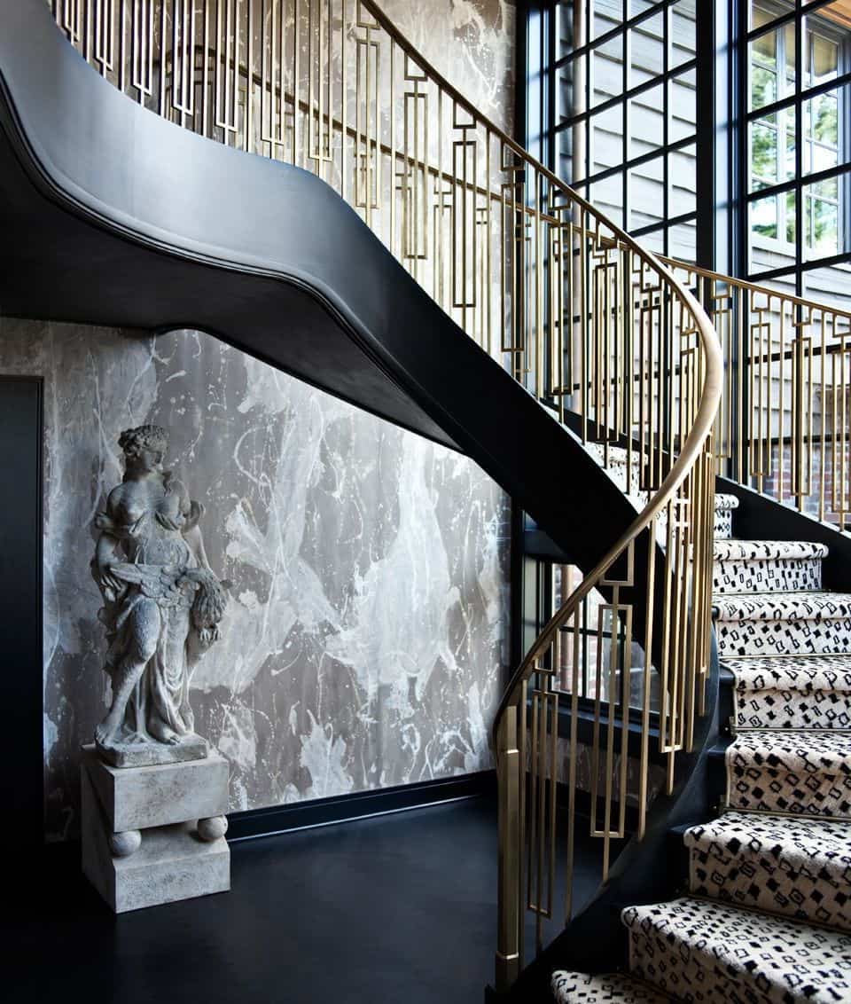 Поскольку лестница на второй этаж служит одним из ключевых элементов интерьера, ее форма и цветовое решение выполняется в определенном стиле, поддерживающем общий антураж.