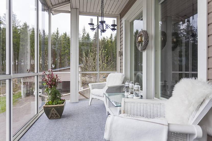 Белый цвет визуально поднимет потолок, увеличит площадь небольшого помещения. Если в остеклении использованы холодные системы, потолок можно покрасить, отделать вагонкой, предназначенной для наружных работ. Хорошим вариантом являются потолочные пластиковые панели или плитка.