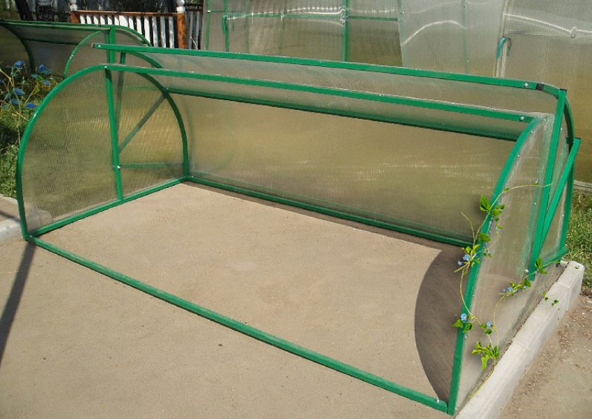Парник представляет собой небольшую конструкцию, используемую преимущественно для выращивания рассады, ранних всходов и корнеплодов. Большим и высокорослым растениям в таком помещении будет некомфортно, так как конструкция достаточно низкая.