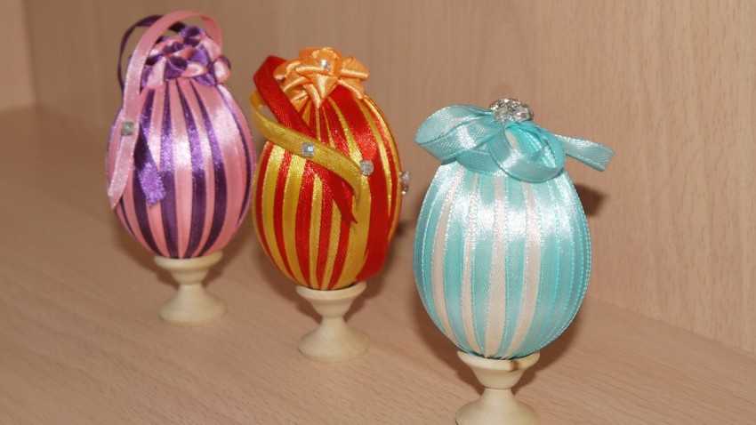 Можно использовать ленты. Возьмите узкие атласные ленты, прикрепите один конец к узкому концу яйца с помощью клея «Момент» или двустороннего скотча. Аккуратно натягивайте ленту и обмотайте ей заготовку. Закрепите концы вверху. Дополните поделку украшениями: искусственными цветами, стразами, бисером.