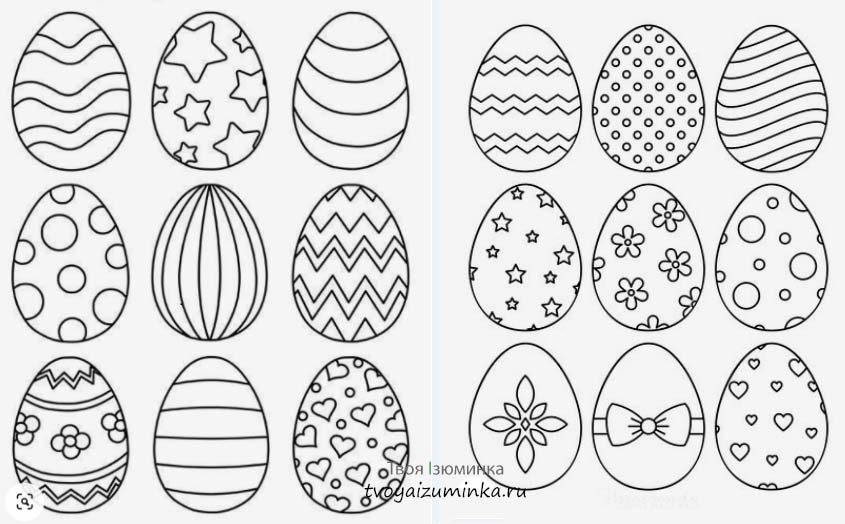 По шаблону нарисуем яйца, которые разукрасим разными красками и узорами. После вырежем их ножницами.