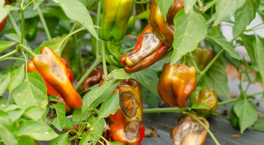 Растения, зараженные грибком фитофторы, дают плоды с темными, быстро чернеющими пятнами. Сначала пятно образуется на шкурке, но потом переходит на мякоть перца, делает его непригодным к потреблению.