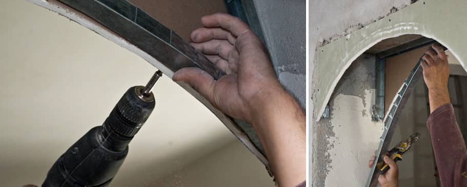 По подобной схеме возводится гипсокартонная переборка с проемами разнообразной формы. Они также обрамляются разрезанной направляющей, способной точно повторить любые изгибы. Если «волнистость» незначительна, гипсокартон без труда принимает необходимую форму. Можно использовать более гибкие и менее ломкие арочные ГКЛ. Остается только закрыть шпаклевкой швы и подготовиться к декоративной отделке.