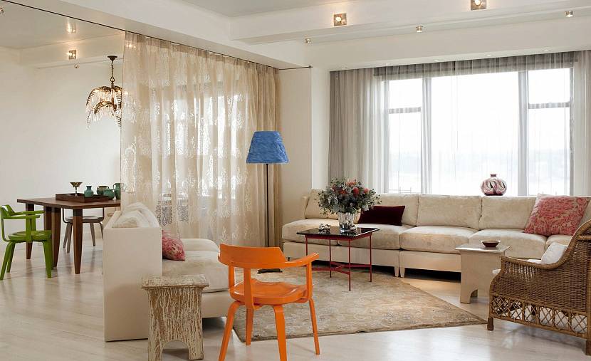 - Универсальность. Кроме зонирования, шторы могут выполнить еще одну функцию – скрыть огрехи ремонта.