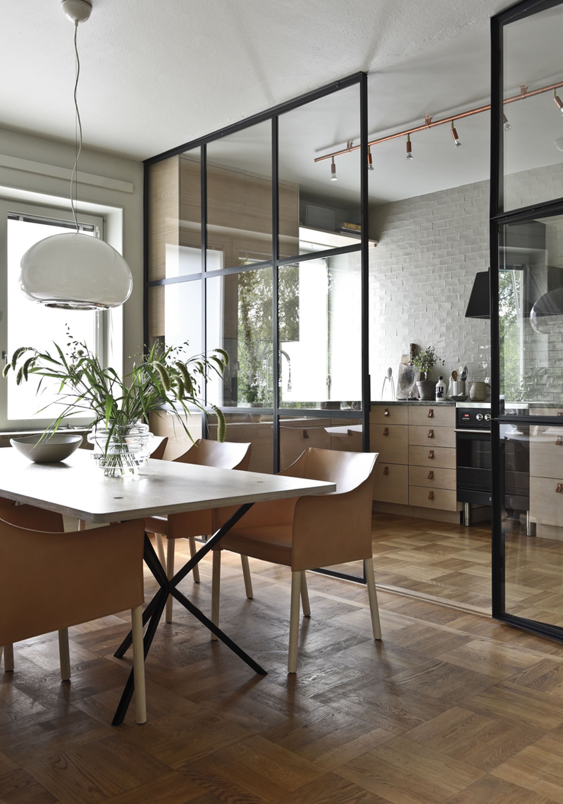 Полупрозрачное сооружение будет частично пропускать свет, поэтому является хорошим решением для кухонь без окна. Но в рабочей зоне всё равно нужно продумать дополнительную подсветку.