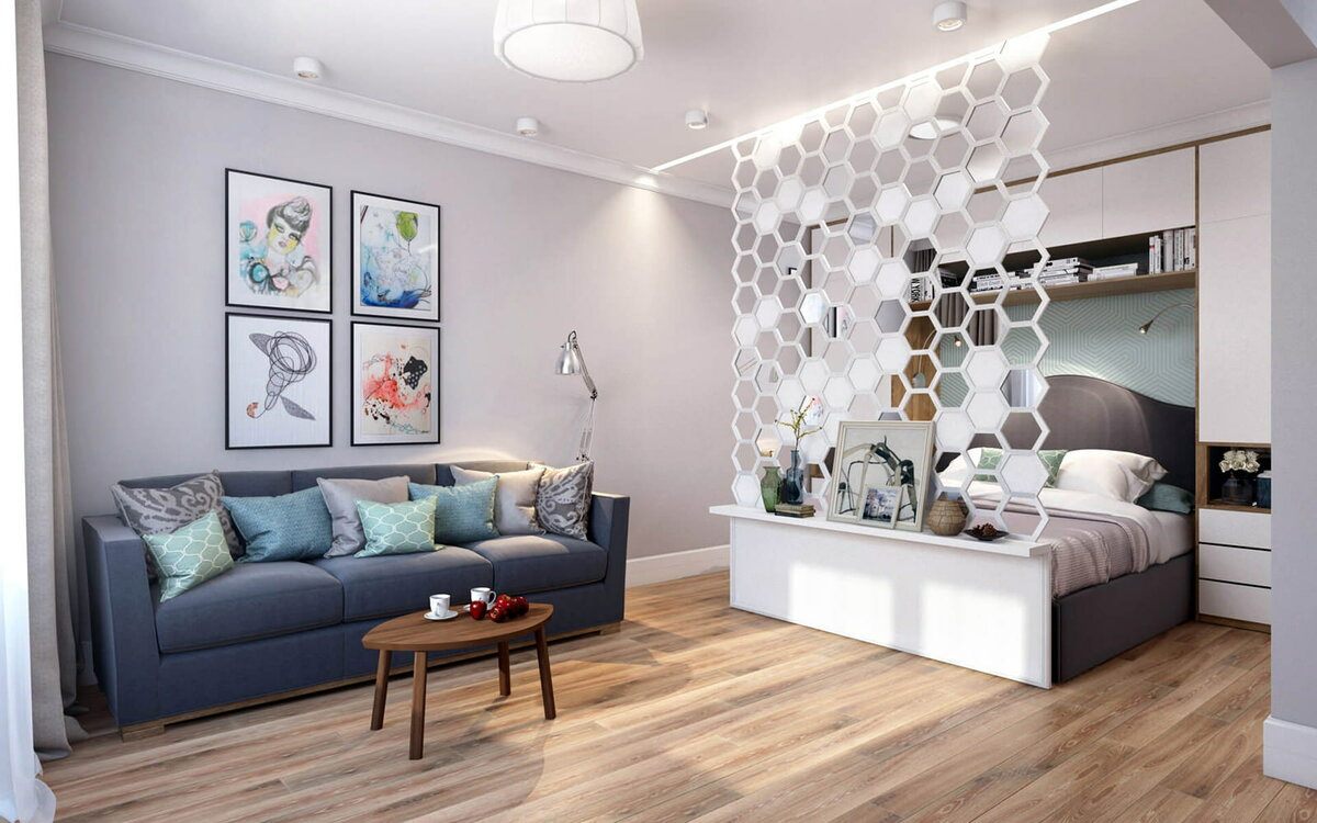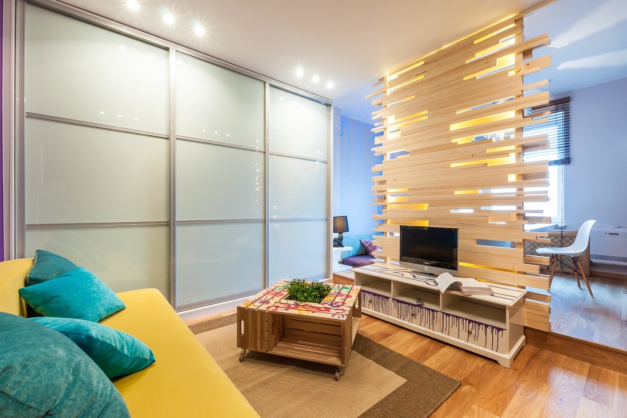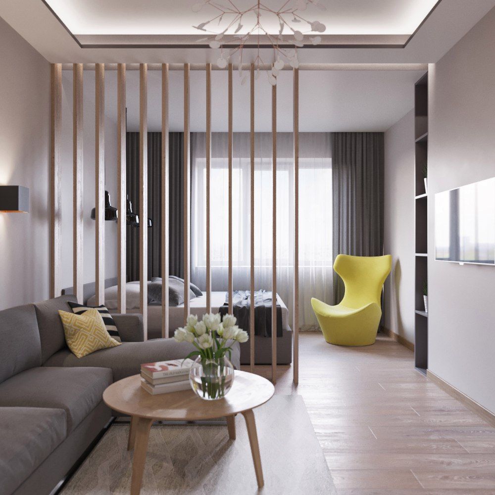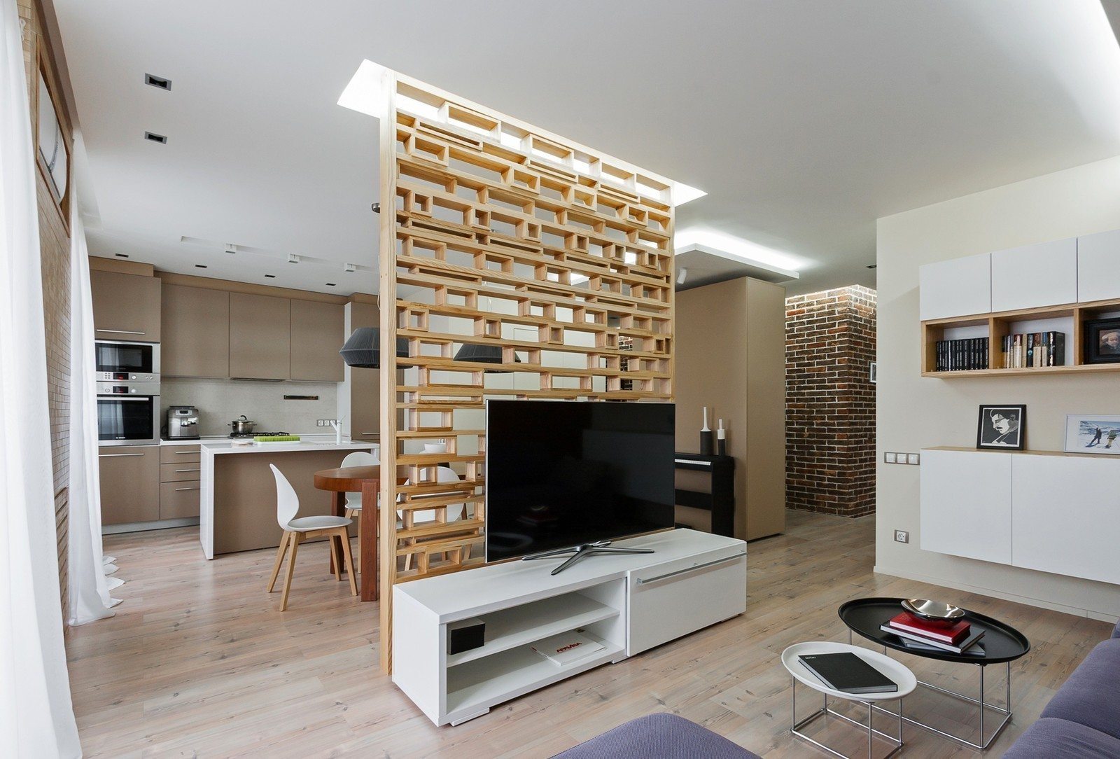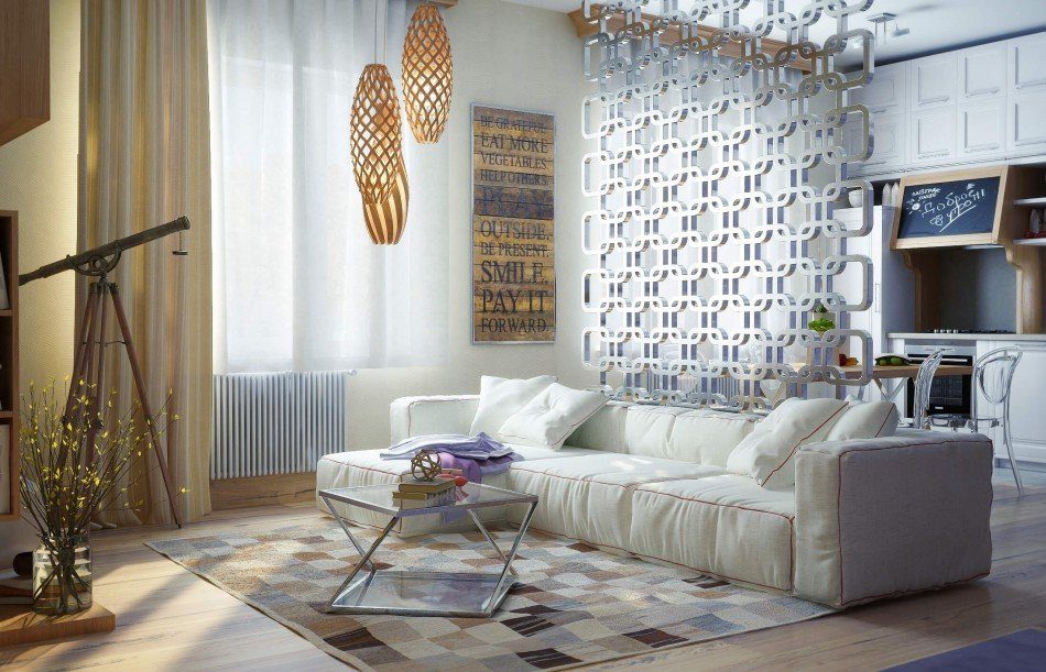 Чаще всего в студии делают перегородки между кухней и гостиной. Возводить цельную стену довольно трудозатратно, можно отделить эти зоны легкой конструкцией, которая не будет уменьшать пространство.