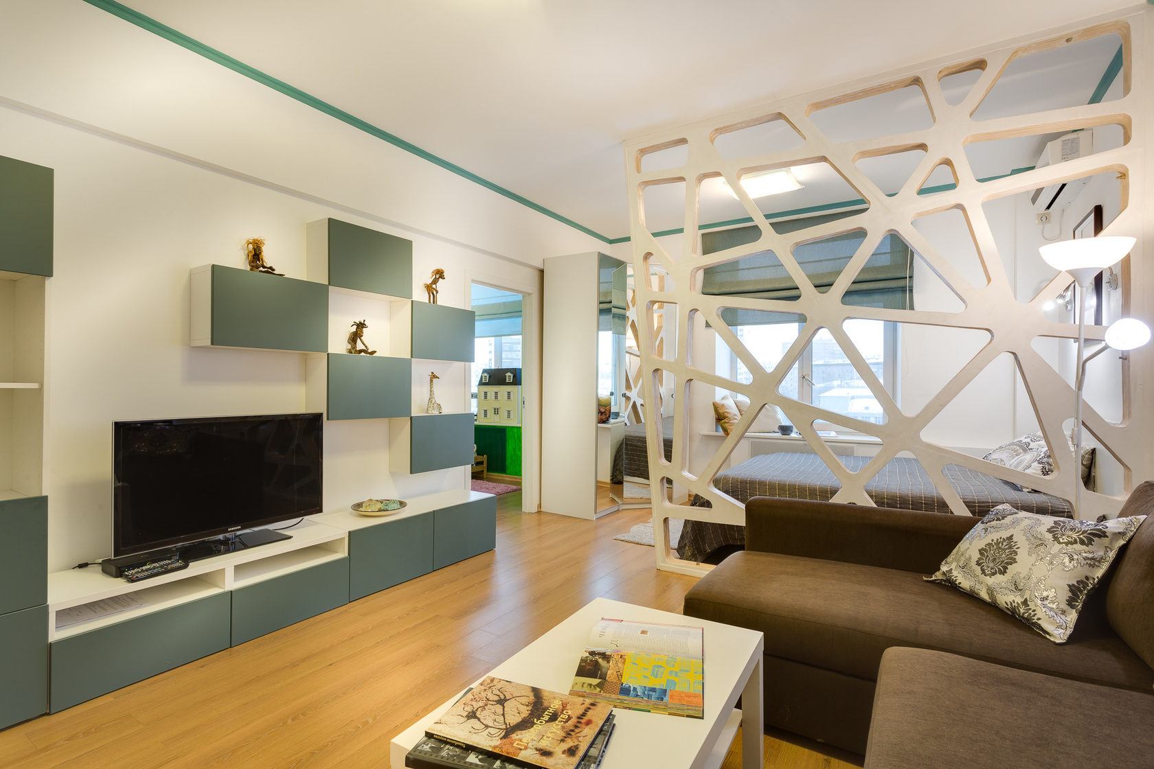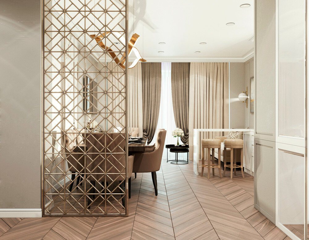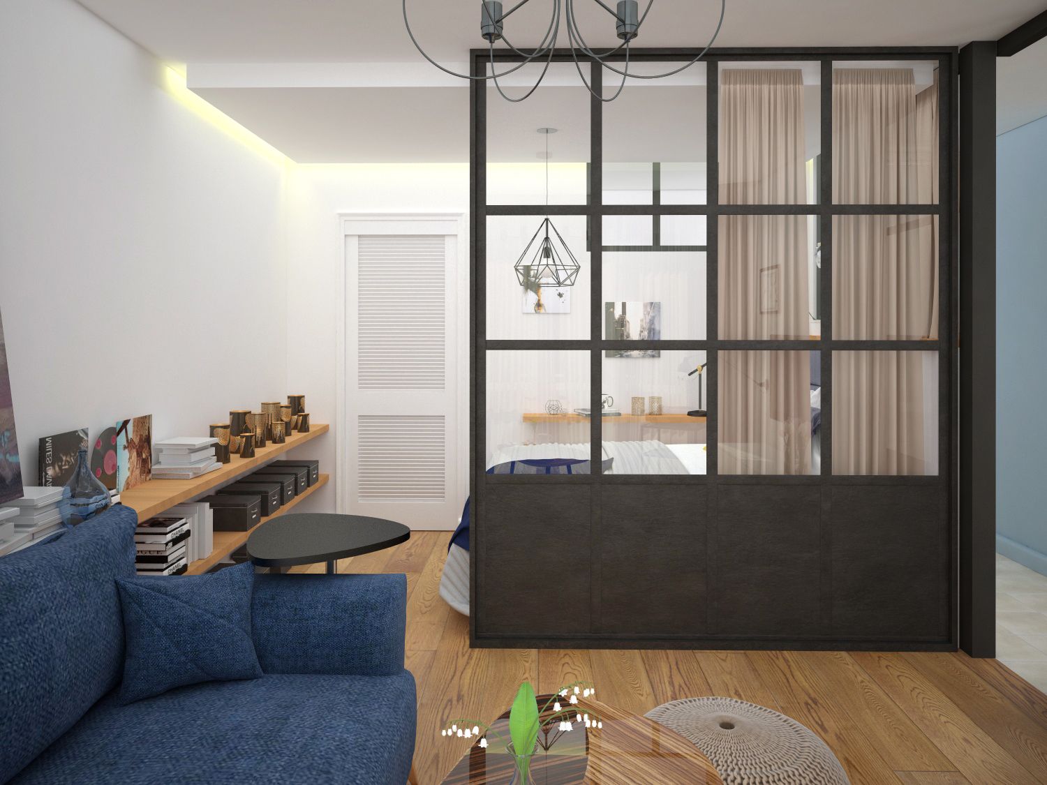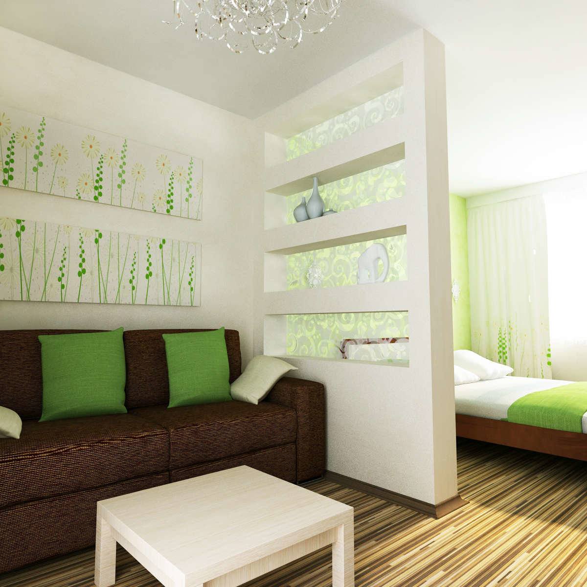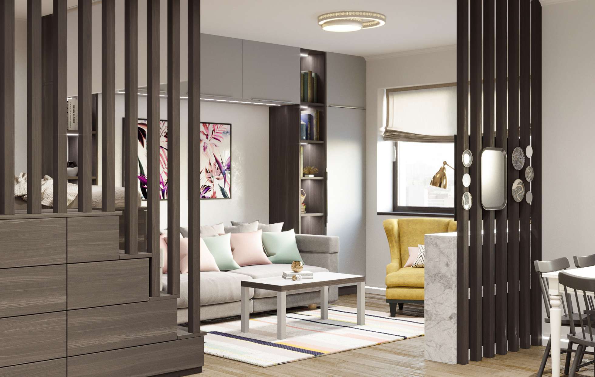 Чаще всего в студии делают перегородки между кухней и гостиной. Возводить цельную стену довольно трудозатратно, можно отделить эти зоны легкой конструкцией, которая не будет уменьшать пространство.