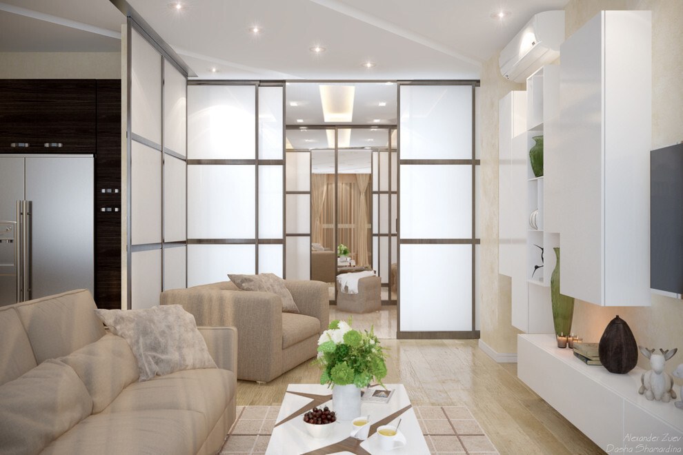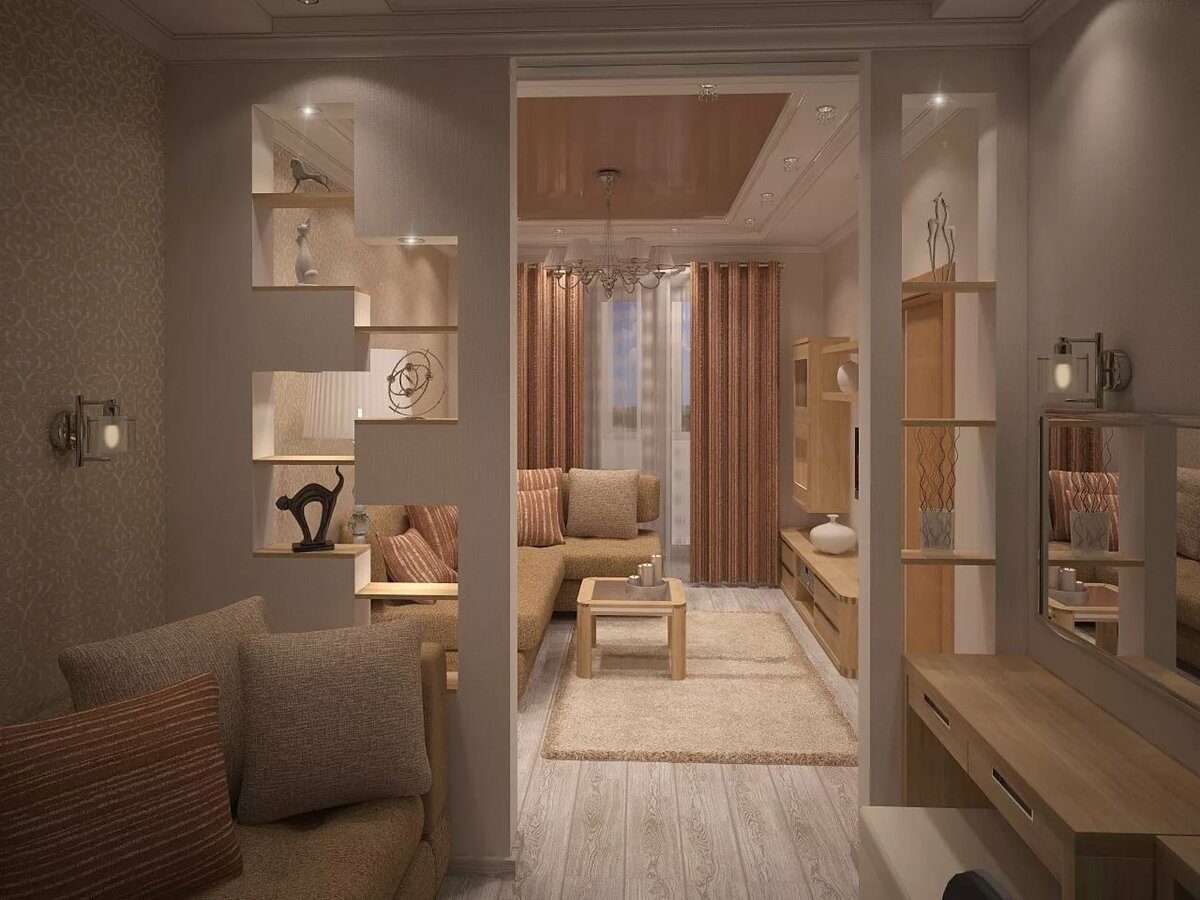 Разделение посредством гипсокартона со встроенными шкафами позволяет визуально увеличить пространство зала. Это идеальное решение для людей, желающих быстро видоизменить квартиру, без проведения ремонтных работ.