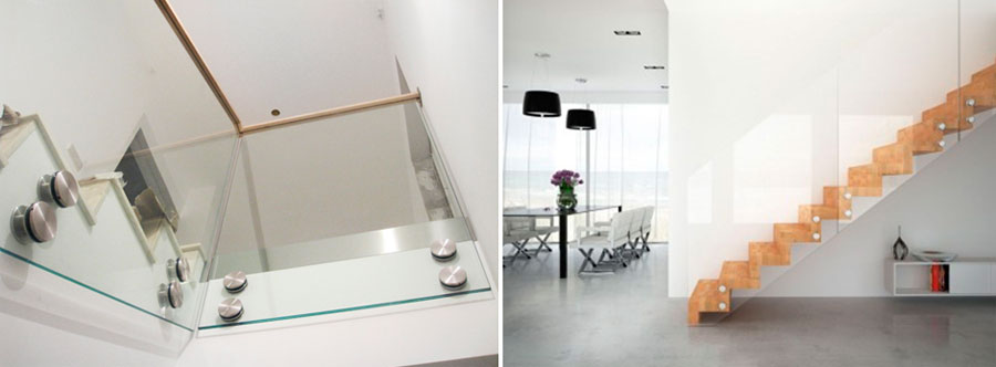 Использование стеклянных или пластиковых прозрачных перил в виде экранов позволяет создать более легкий образ лестницы для современного интерьера. Единственный недостаток – отсутствие перил в идее, к которому мы привыкли, невозможность опираться на крепления. Но при таких коротких маршах этот недостаток несущественен, если только в доме нет пожилых людей с проблемами передвижения.