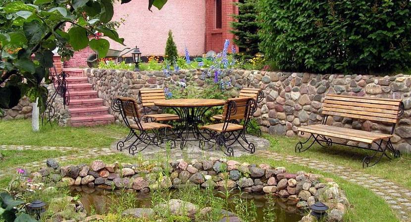 Зону отдыха предпочтительно расположить ближе к дому. Отгородить ее можно живой изгородью из красивоцветущих растений или декоративным заборчиком