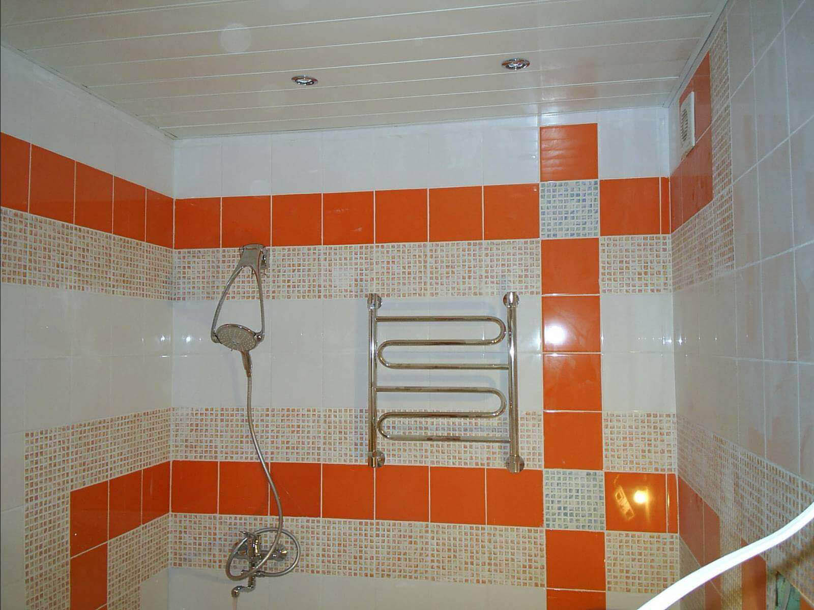 Следует упомянуть и о диагональном расположении планок. Этот вариант встречается в единичных случаях, ибо он плохо совмещается с облицовкой стен и прямоугольной формой самой ванной комнаты. Единственный вариант, когда диагональная установка пластиковых панелей на потолке будет смотреться достойно, это квадратная ванная комната, со смещённым к одному из углов входом.