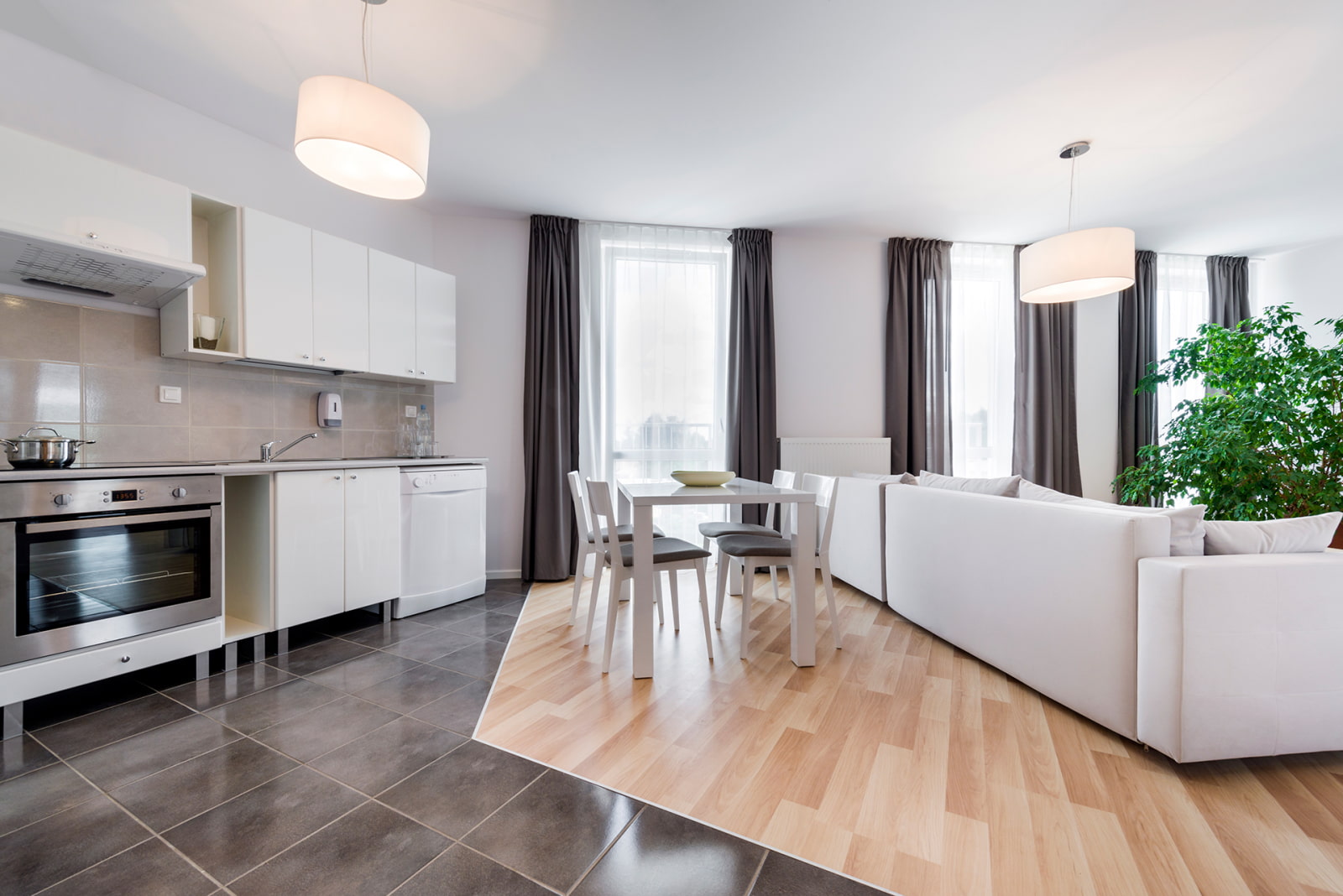 Плитка на полу в кухне-гостиной является идеальным решением. Особенно, если ее сочетать с ламинатом жилой комнаты, зонируя полезное пространство общего помещения.