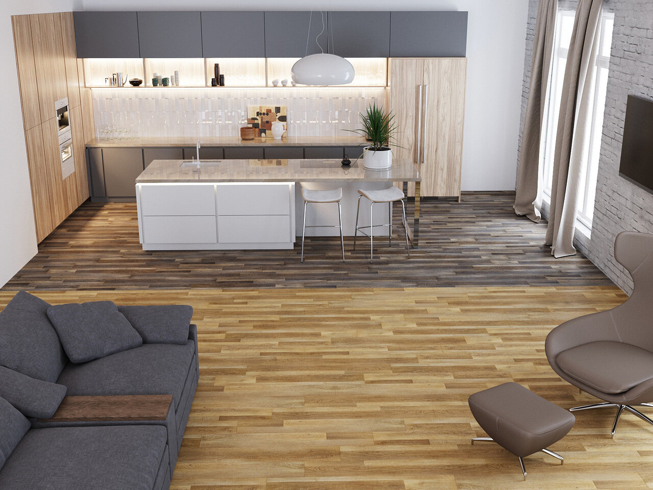 Особенное значение нужно придать оформлению совмещенных комнат (кухонь-гостиных, кухонь-столовых, гостиных с террасой в частных домах и т.д.). Часто в подобных помещениях комбинируют несколько напольных покрытий, например, керамическую плитку и паркет или ламинат, плитку с разными характеристиками (например, для открытых неотапливаемых помещений как терраса, плитка нужна морозостойкая, более устойчивая к истиранию).