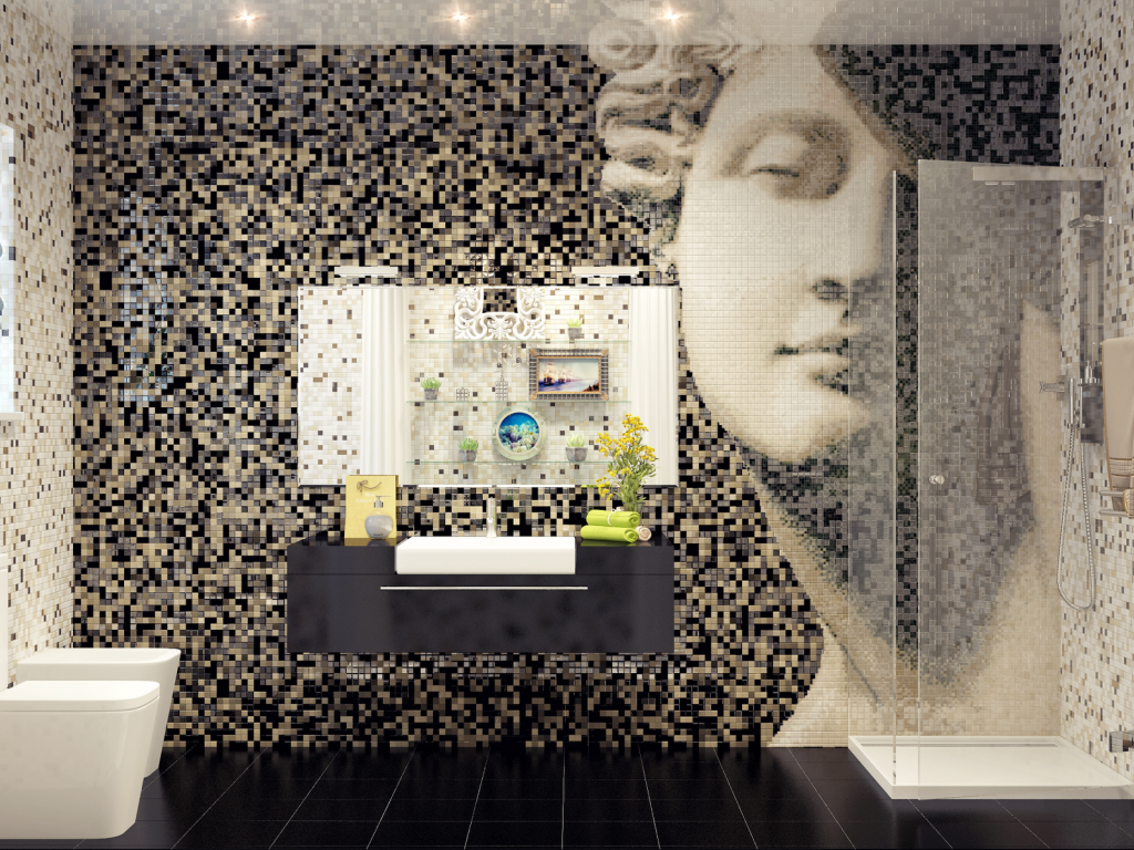 - маленькие частицы позволяют создать сложное панно в ванной комнате, полностью обеспечивающее индивидуальность дизайна и передачу наименьших деталей.