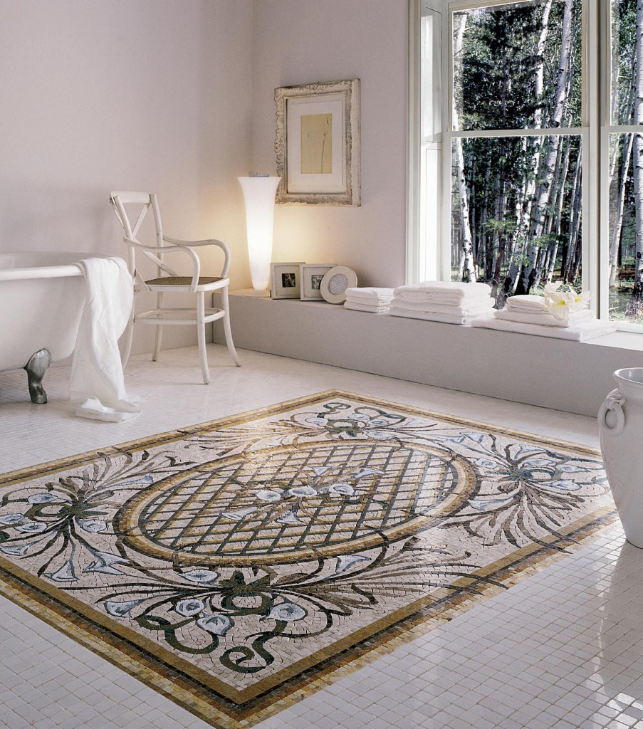 При облицовке пола мозаикой рекомендуется учитывать окружающее пространство в ванной комнате – остальные поверхности должны быть облицованы плиткой или другими материалами с природным рисунком. Камень можно использовать и для создания акцентов.