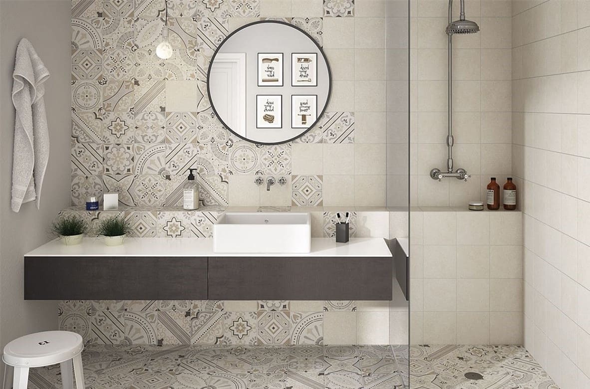 В минималистических интерьерах выполняется отделка блоками patchwork нейтральной гаммы (светло-серый, бежевый) и комбинации пастельных тонов. Керамические блоки с графичными орнаментами позволят создать акцентные участки и визуально расширить помещение.