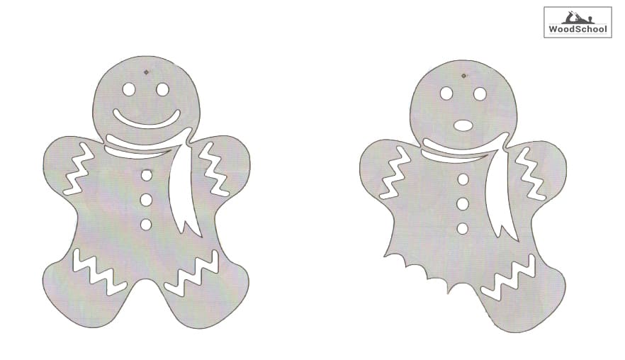 Начните с выпиливания внутренних элементов, а затем обрежьте фигурки по периметру, так вы уменьшите риск поломки хрупкой игрушки. Учитывая большое количество тонкой работы, для этого проекта лучше использовать пилки #3 с реверсным зубом, которые помимо более контролируемого реза снизят вероятность сколов на обратной стороне изделия. Удалите бумажный шаблон: если для переноса использовался клей, сошлифуйте остатки бумаги наждачкой P180. Если планируется нанесение прозрачной отделки, дополнительно сделайте чистовую шлифовку зерном P280.