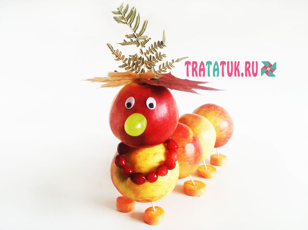 Еще одна замечательная осенняя поделка — гусеница из яблок. Яблоки скрепляем между собой с помощью зубочисток. Так же с помощью зубочисток прикрепляем к яблокам половинки морковок — это будущие ножки нашей гусеницы.