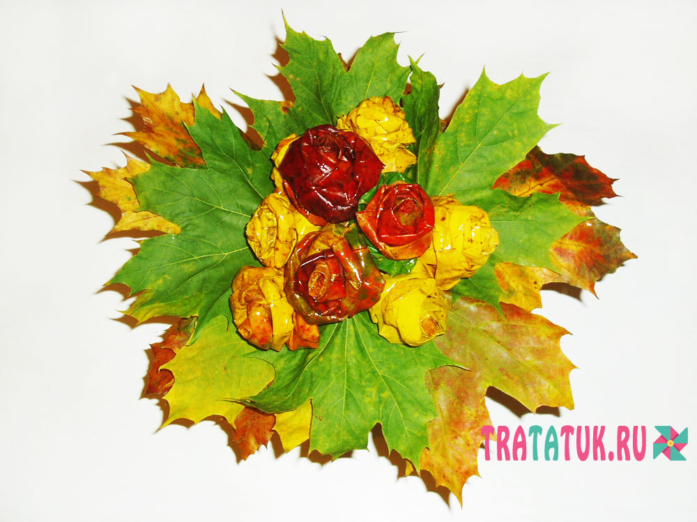 Букет роз из кленовых листьев: пошаговое выполнениеНапример, оформить розу из кленовых листьев: