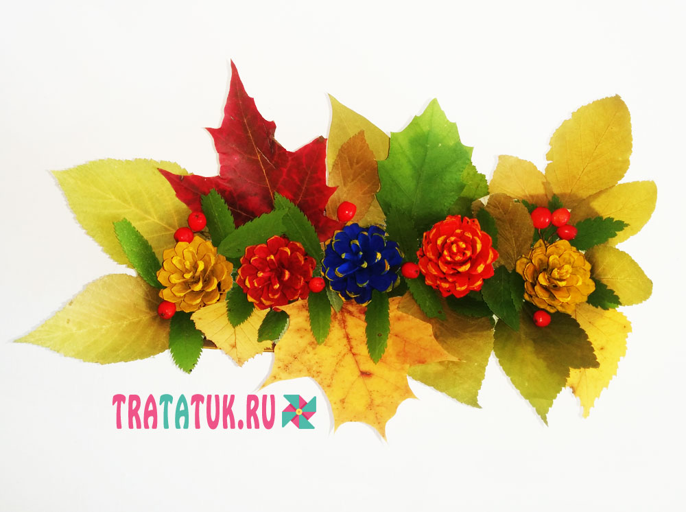 При изготовлении панно, следует учитывать окраску листьев, цветов, трав и прочего – на темном фоне хорошо смотрятся светлые детали и наоборот. Вот несколько простых идей, описанных пошагово, для самых маленьких: