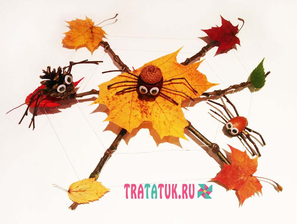 - паучки – выполняются из каштанов, шляпок желудей, согнутых посредине зубочисток. При желании на восемь паучьих ножек вылепливаются сапожки из пластилина или пластики;