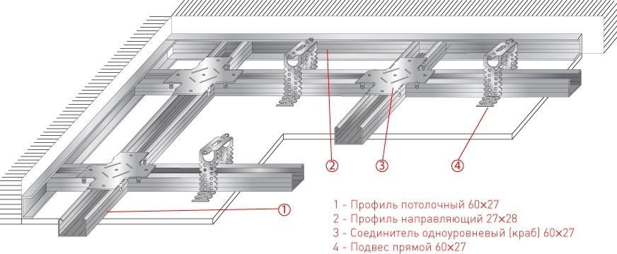 Направляющий профиль, потолочный профиль и подвес. Так они выглядят если исключить из рисунка другие элементы.