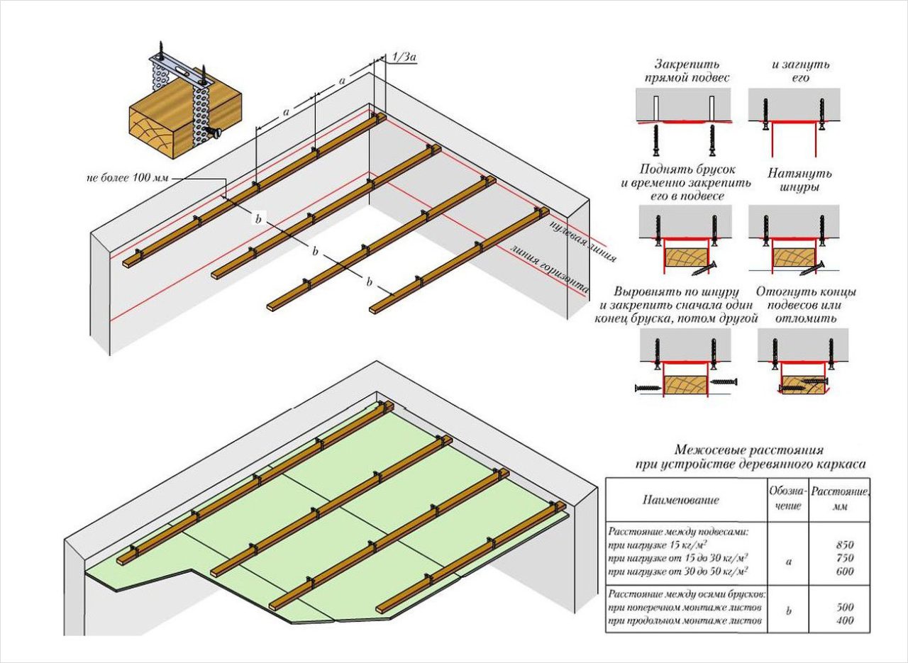 Чтобы скрыть неровности и дефекты потолочной поверхности или выкроить пространство для укладки утеплителя, требуется создание каркаса из деревянных брусьев или мтеллопрофиля. Брусья выбираются с минимальным размером сечения 50х40 мм. Перед применением брус обрабатывается антисептиками и антипиренами.