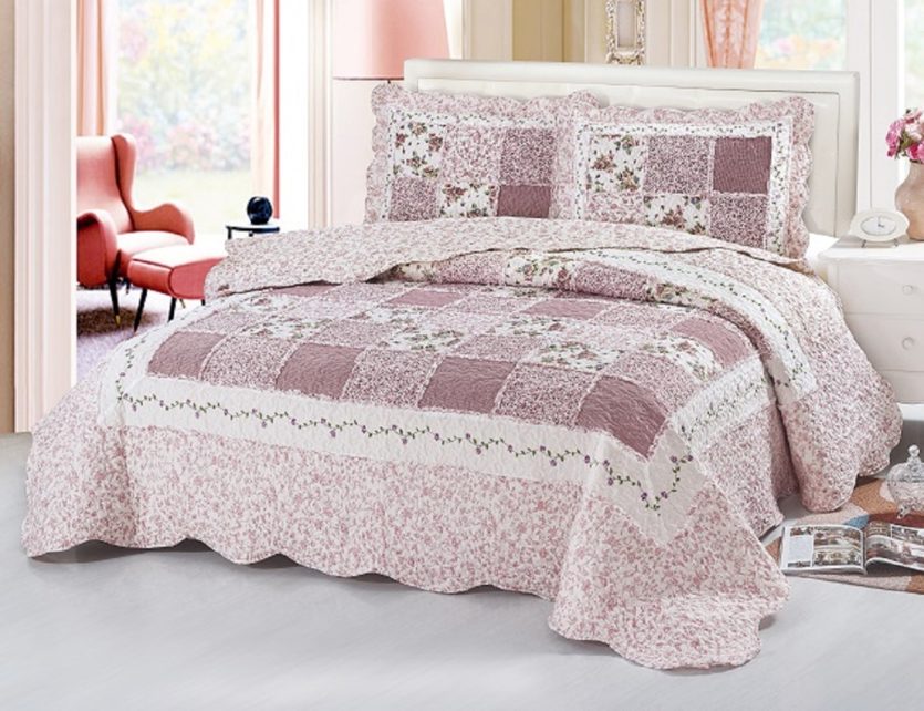 - Спальня прованс или шебби-шик декорируется светлыми тонами. Наиболее подходящим покрывалом будет полотно с цветочными узорами, выполненными в кремовых, светло-розовых тонах;