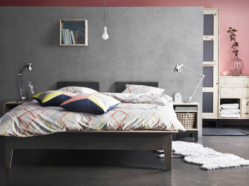 Розовая кровать станет главным объектом в спальне, а шторы или предметы декора могут перекликаться по цвету.