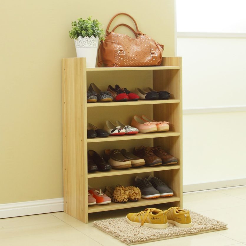 - Обувная полка. В отличие от других видов, она не вешается на стену, а устанавливается на полу. Угловые обувные полки могут быть высокие, низкие, большие и маленькие. Их размеры зависят от количества обуви.