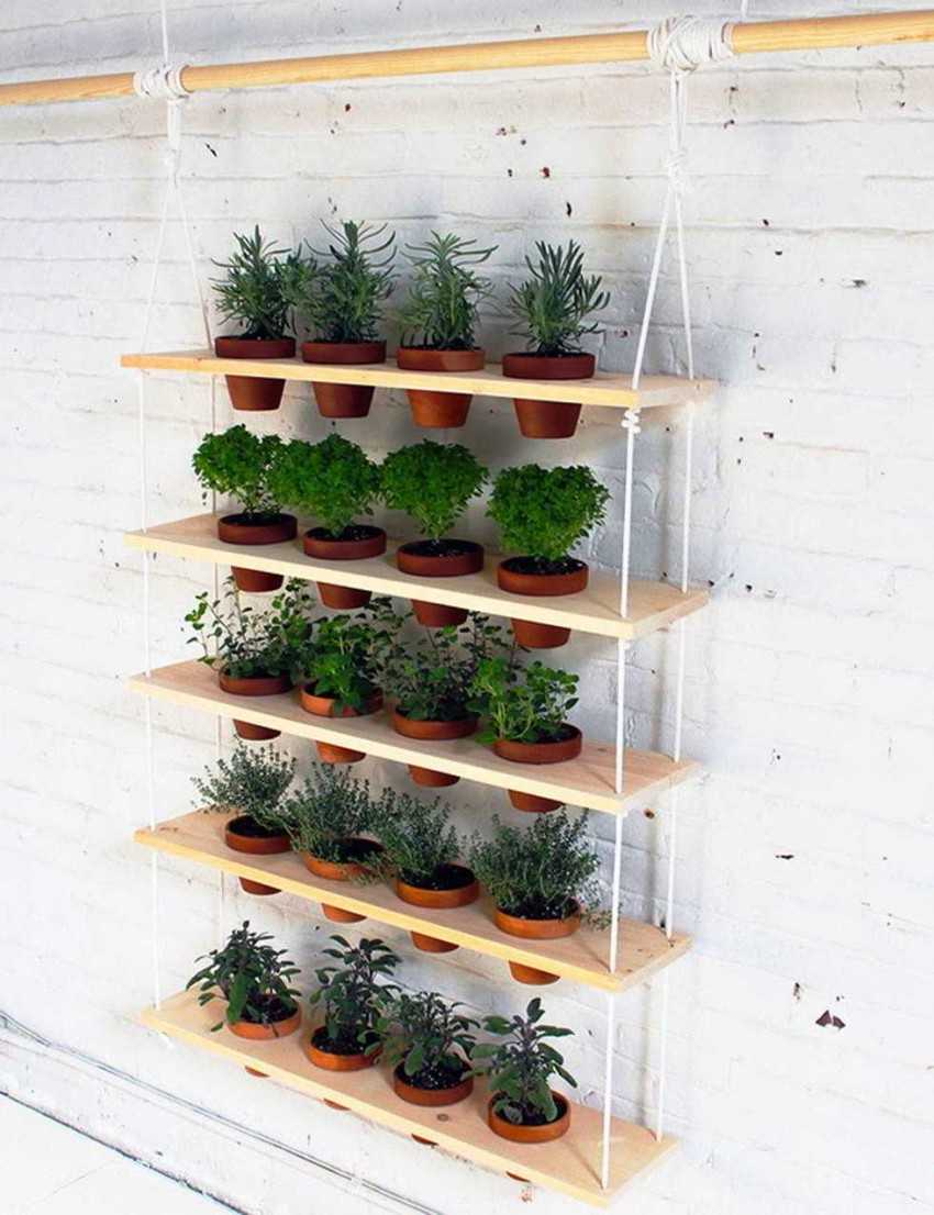 Популярны простые полки из дерева, которые крепятся на веревках. Отличительная особенность — выемки под размеры каждого горшка. Отлично вписываются в дизайн эко или кантри. Для того чтобы сделать подставку, понадобится: