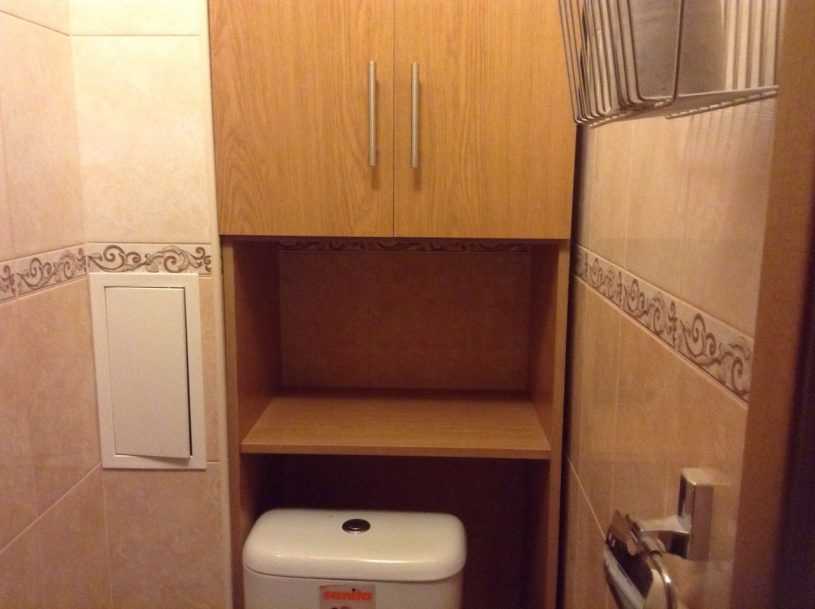 Если за унитазом располагаются трубы, то их можно спрятать внутри встроенного шкафа. Вернее шкафчик организуется внутри короба из листового материала – ДСП, фанеры, ГКЛВ. Стоимость такого шкафа в итоге будет меньше, а эстетическая составляющая лучше – помещение будет казаться просторным, свободным от мебели. И каркас, и фасад такого шкафа под силу изготовить даже новичку: нишу потребуется оборудовать только полками и дверцами.