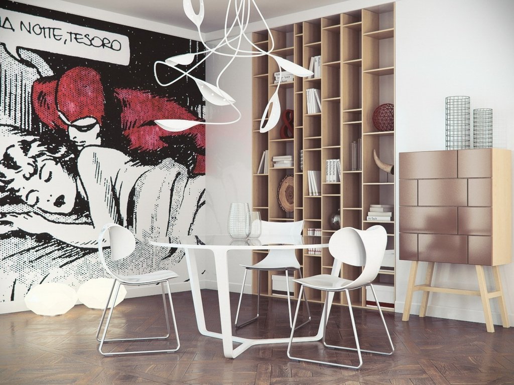Многоцветность и разнообразие форм лучше всего сбалансировать с помощью стен нейтрально-белого цвета. В традиционной интерпретации поп арт применялся для просторных помещений и комнат с большой квадратурой.
