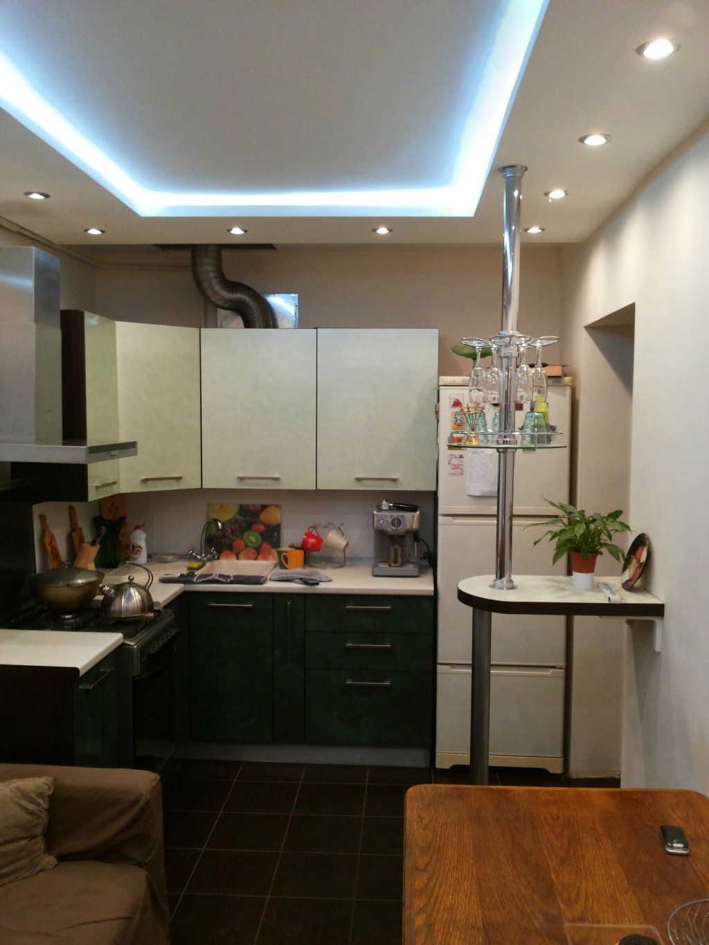 В последнее время стали популярны изогнутые линии на потолке. К сожалению, они подходят не всем интерьерам. Линии визуально разделяют помещение на несколько зон. В частности, если кухня соединена с залом. Такой шедевр на потолке изобразить непросто.