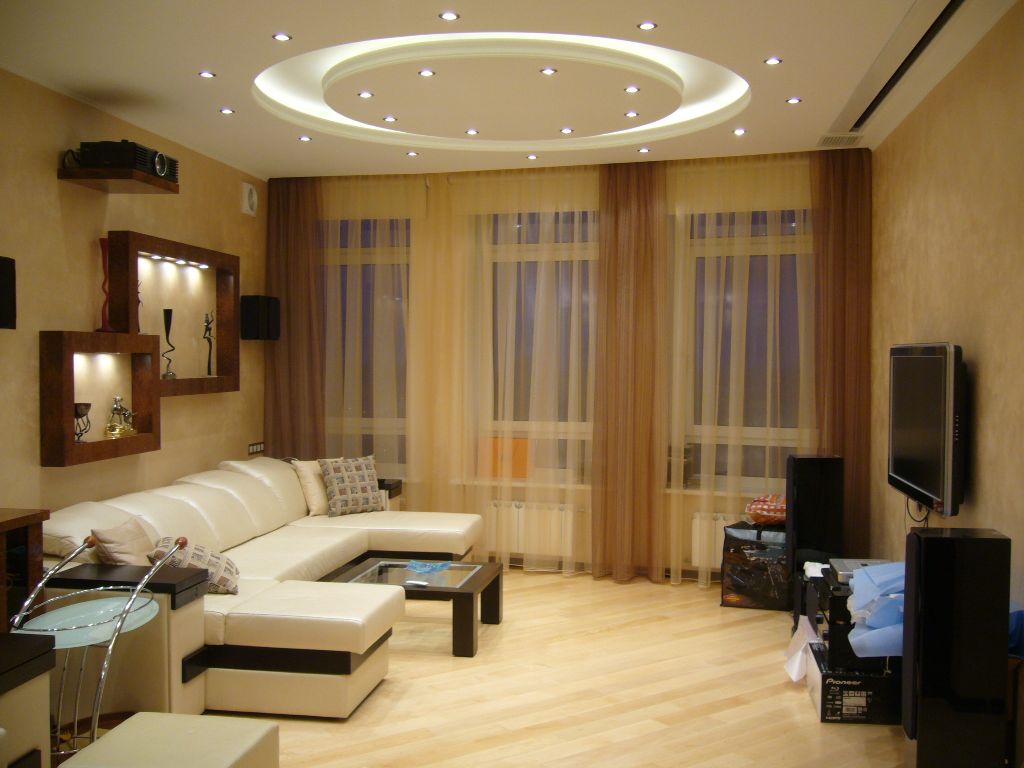 - Гипсокартонные потолки для зала полностью скроют недостатки базового потолка и закроют коммуникации.