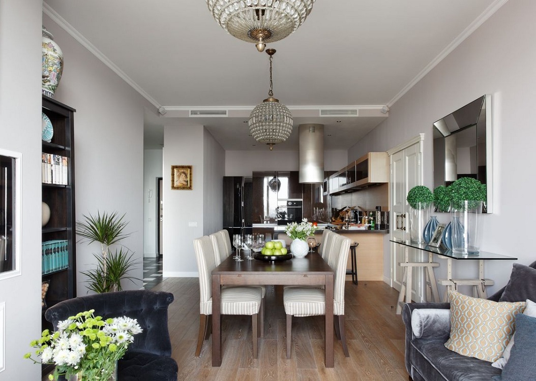 С помощью совмещения помещений можно существенно увеличить гостиную, сократив площадь кухни, или наоборот, если одной из зон пользуются больше или меньше. При этом появляется возможность проводить время всей семьей, пока кто-то готовит, а кто-то отдыхает после рабочего дня у телевизора.