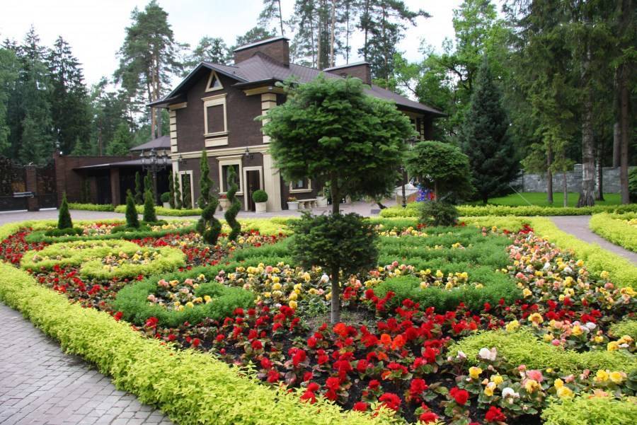 Например, деревья, кусты, цветочные клумбы располагают в форме прямоугольников или квадратов с ровными границами. Также возможна посадка растений и в виде других геометрических фигур, соответствующих общей стилистике плана.
