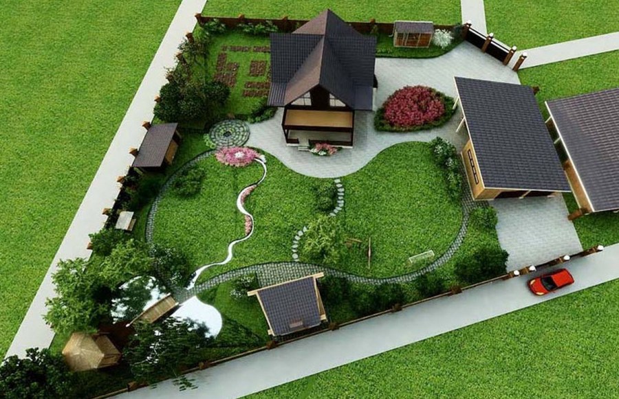 Для участков сложной геометрической формы важен индивидуальный подход. Максимально относите все хозблоки в самые неудобные места, а центральную часть оставьте для дома и места отдыха.