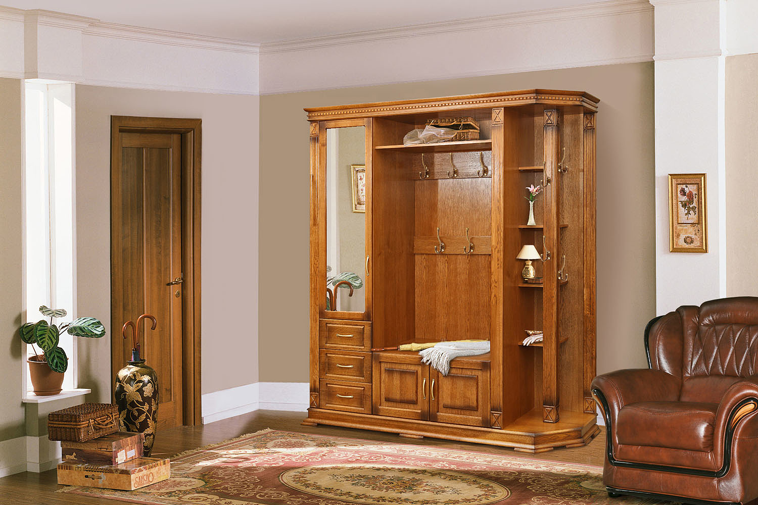 Как правило, изделия из натуральной древесины устанавливают в таких стилях, как ампир, барокко и рококо. В качестве натуральной деревянной мебели в переднюю используют именно корпусные модели.