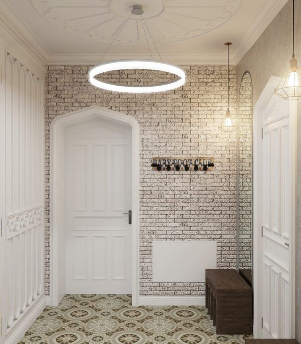 Возможно комбинировать старинные элементы с современными. Например, в коридоре отлично сочетается кирпичная стена с модной подсветкой.