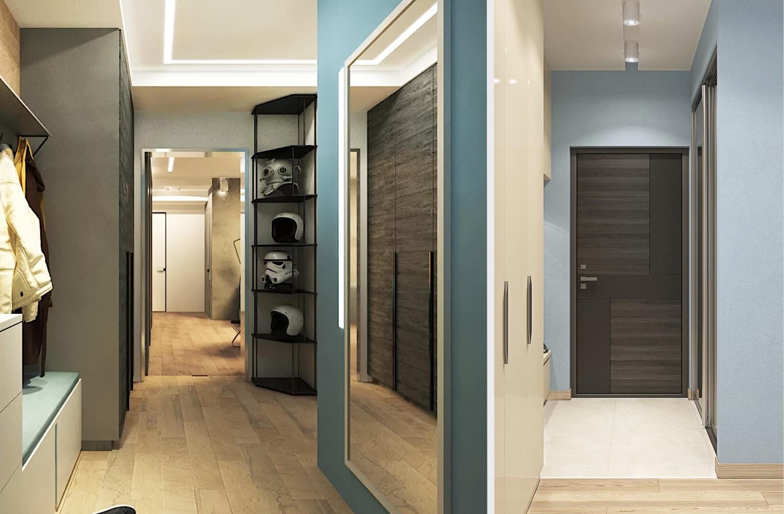 Прихожая и коридор должны быть наиболее тщательно продуманы, ведь это то место, с которого начинается знакомство с помещением. Не забудьте про яркое освещение и светлые оттенки. А одежду скройте в шкафу-купе.