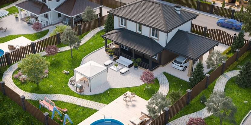 В непосредственной близости от дома можно распланировать зону отдыха, оборудовав ее спортивной или детской площадкой, а также просторной беседкой, в которой все семейство может укрыться в знойный полдень или непогоду