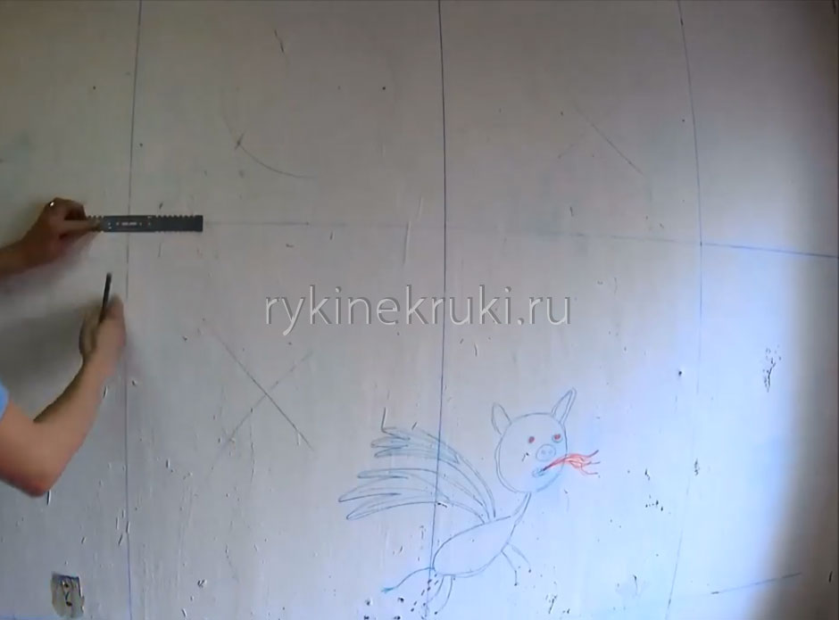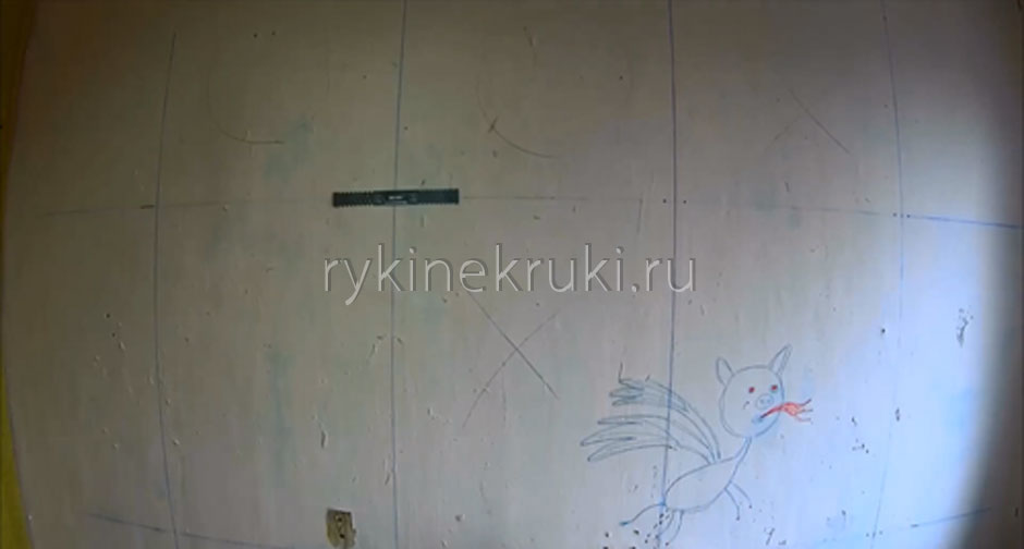 Итак, берем подвес и ставим его к стене так, чтобы центральная вертикальная линия разметки проходила ровно посередине подвеса (как бы деля его на две части), а горизонтальная — сквозь отверстия в подвесе, через которые будем крепить подвес к стене: