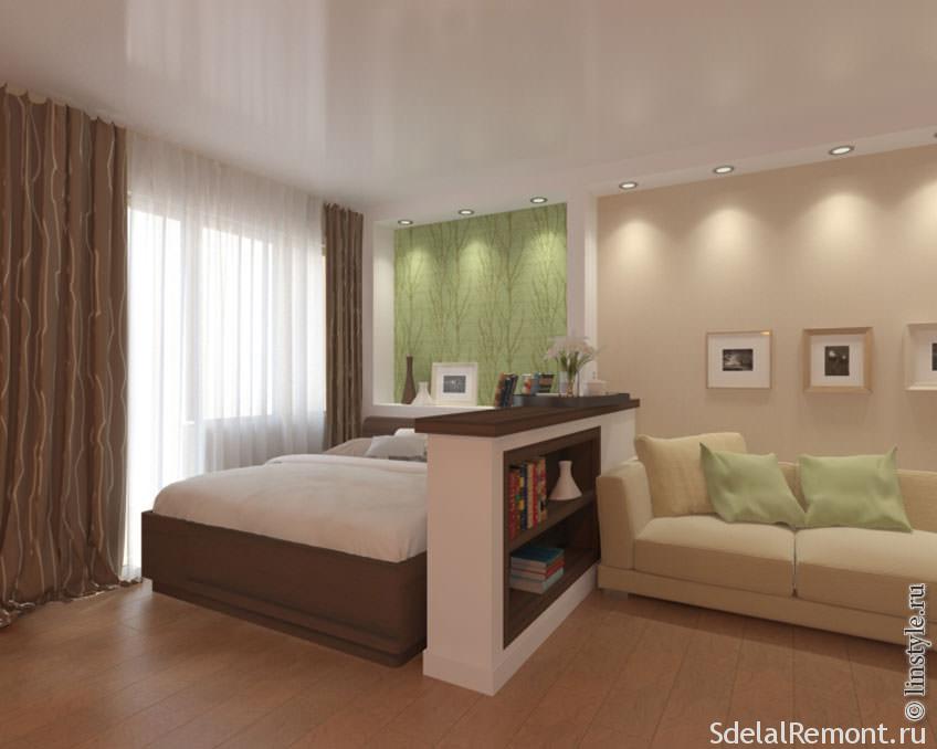 В том случае, если под спальню выделить часть комнаты, то занавески, ширмы или перегородки не должны доходить до потолка, чтобы в остальной части гостиной не было темно. Нужно сказать, что это не самый лучший вариант, поэтому кровать чаще всего устанавливают в углу.